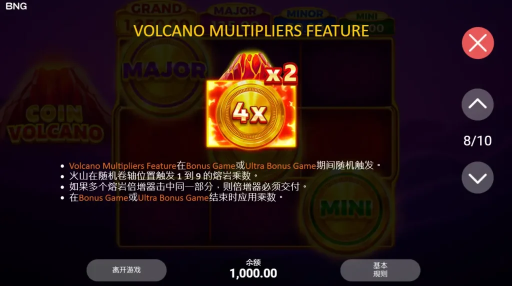 這還沒完!在彩金遊戲期間,火山倍增功能隨時可能爆發。噴發的岩漿會包括一到九個火山倍增符號,能掉落在任何隨機卷軸的位置上,讓你輕鬆贏取高倍數獎金!